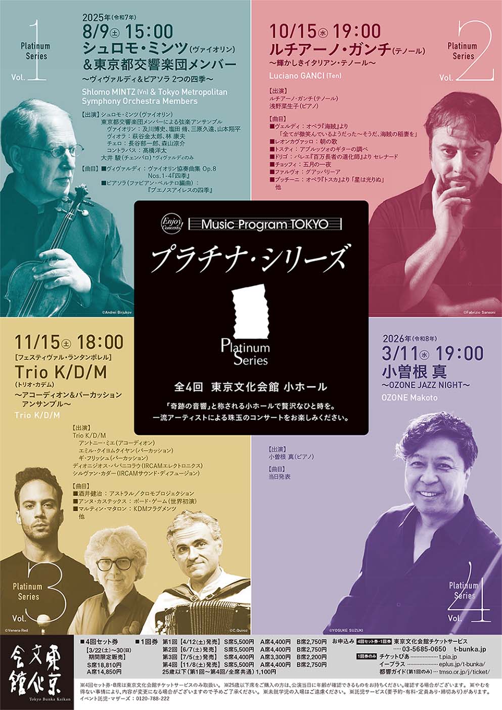 会 場:東京文化会館 小ホール JR上野駅「公園口」より徒歩1分 東京メトロ銀座線・日比谷線「上野駅」より徒歩5分 時 間 開演 18:00 出 演:アントニー・ミエ(Acco)、エミル・クイヨムクイヤン、ギ・フリッシュ(Perc.) プログラム:ボードゲーム(世界初演)、アストラル/クロモプロジェクション 他 料 金:S席4,400円、A席3,300円、B席2,200円 チケット:チケットぴあ(t.pia.jp)、イープラス(eplus.jp/t-bunka/) |