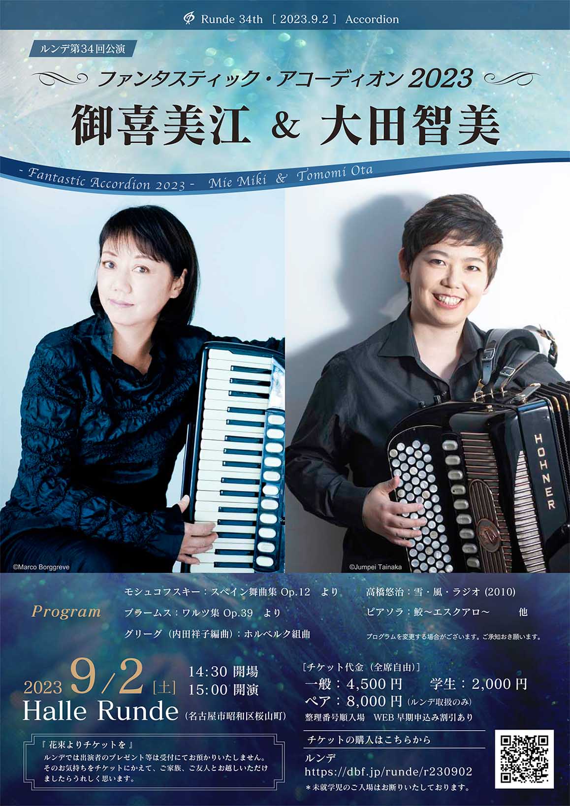 ファンタスティック・アコーディオン 御喜美江&大田智美 会 場:Halle Runde (名古屋市昭和区桜山町) 名古屋市営地下鉄桜通線「桜山駅」徒歩10分 時 間 開場 13:30 開演 15:00 出 演:御喜美江、大田智美 プログラム:モシュコフスキー作曲 スペイン舞曲集Op.12より」 ブラームス作曲 ワルツ集Op.39より ほか 料 金:全席自由 一般4,500円 学生2,000円(当日+500円) ペア8,000円(ルンデ取扱いのみ) 整理番号順入場、WEB早期申込み割引あり チケット https://dbf.jp/runde/r230902 |